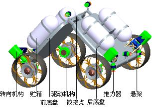 底盘中包含了悬架、车轮、车轮驱动机构、转向机构、液体推进剂贮箱、推力器(发动机)等,其布局如图2所示。