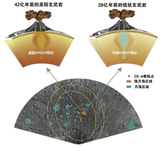 同位素定年分析可以确定样品形成于什么时代,就像人可以知道什么时候出生的一样,而同位素组成就如同人的基因一样,可以用于判别岩石是从哪里来的。中国科学院广州地球化学研究所团队(以下简称“我们团队”)针对性地升级改造了现有的同位素分析技术,对月球背面月海低钛玄武岩进行分析,低钛玄武岩岩浆来自于一个极度亏损钾(K)、稀土(REE)、磷(P)组分(简称KREEP,富含放射性生热元素,传统观点认为其能为月球持续的火山活动提供热源)的月幔源区。我们团队首次揭示了嫦娥六号着陆区的火山活动时间为28亿年,证实了月球背面和月球正面同样存在年轻的火山活动。