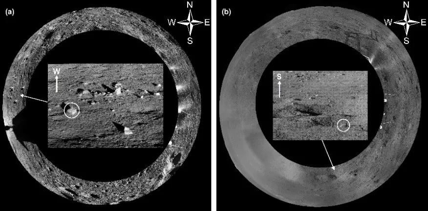 多项研究揭示,嫦娥四号着陆区被35亿年前形成的芬森撞击坑的溅射物覆盖。这些溅射物经历长时间的演化后,形成了一层大约12米厚的细粒月球土壤。而在第3和13月昼期间,“玉兔二号”月球车发现巡视区存在较多的石块(图2)。“玉兔二号”月球车通过详细的就位探测,获得了两块代表性石块的光谱和周围地貌的全景影像图。